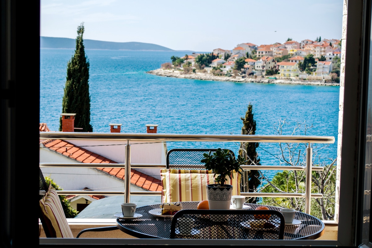 Enyoj this spacious and sun-field apartment designed to make you feel at home. The proximity of the beach 60 m, incredible and open view of the blue sea and sky and all the necessary facilities with which the apartment is equipped, allow the guest to have an ideal vacation from busy everyday life. The proximity of the city of Trogir 4 km, the city of Split 30 km and airport Split 8 km are within easy reach. All this makes this place an ideal place for your beautiful and relaxing vacation.
