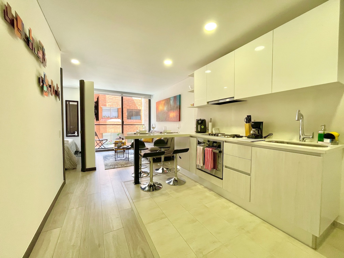 在這個靠近劇院、倫巴和休閒區、公共交通(Transmilenio)的中心住宿享受時尚體驗,大樓內有 24 小時保安,這個地方非常安靜,完全獨立,房源內的隱私僅供您和您的同伴使用的房源。 配備現代化設施,讓您享受位於市中心的寧靜,靠近現代化的購物中心、咖啡廳和許多更適合您需求的地方。