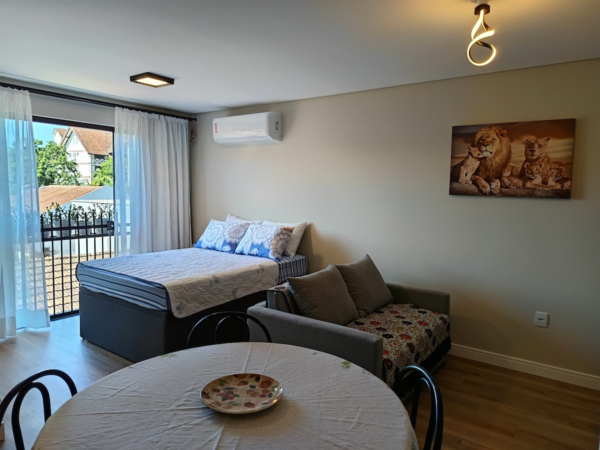 Sofisticado公寓單間公寓距離Vila Germânica Park 800公尺,這是一個活動場所,如慕尼黑啤酒節。 周圍有餐廳、酒吧和超市。 一切都是為了您的舒適: 50英寸三星智慧電視、分體式空調、燃氣淋浴間、240mb光纖WiFi、配備Brastemp冰箱、微波爐、烤箱、爐竈、靴子、咖啡機、淨水器、洗衣機和烘乾機、衣櫃,當然還有一張配有最佳牀墊的迷人標準雙人牀!