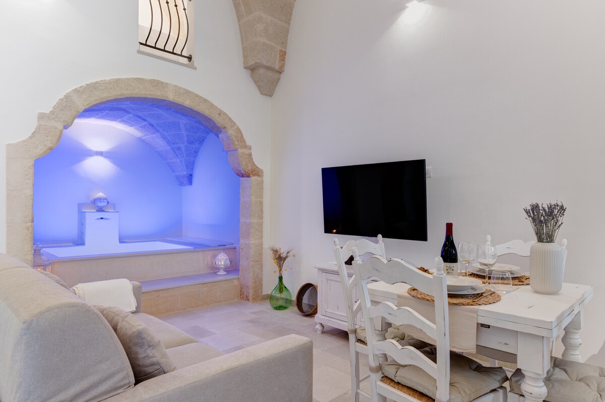 這個獨特的空間,在傳統的圓頂石屋內雕刻,有自己的魅力,讓您體驗伊特里亞谷的真正精神。 您穿過一個舊的草莓葡萄藤架進入。 廚房和衛浴位於壁龕中,而用餐和睡眠區域位於撒拉遜圓頂屋和高圓錐圓頂屋中。 私人露臺和附近的無邊泳池可欣賞山谷和Ceglie Messapica天際線的景觀。