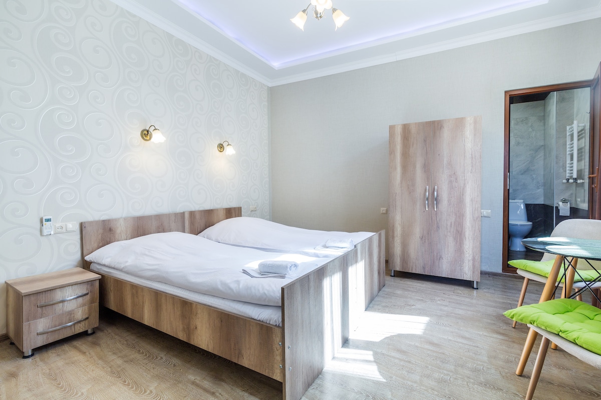 客房位於Gorki街。 Zugdidi Central Botanical Garden和歷史悠久的「Dadiani Palace」前面。 空氣乾淨健康。有很多喬治亞美食店、MC 'Donalds、市場和喬治亞式餐廳。 房東非常樂於助人,英語流利。 公寓寬敞舒適。 一切都是全新乾淨的。距離市中心步行5分鐘。